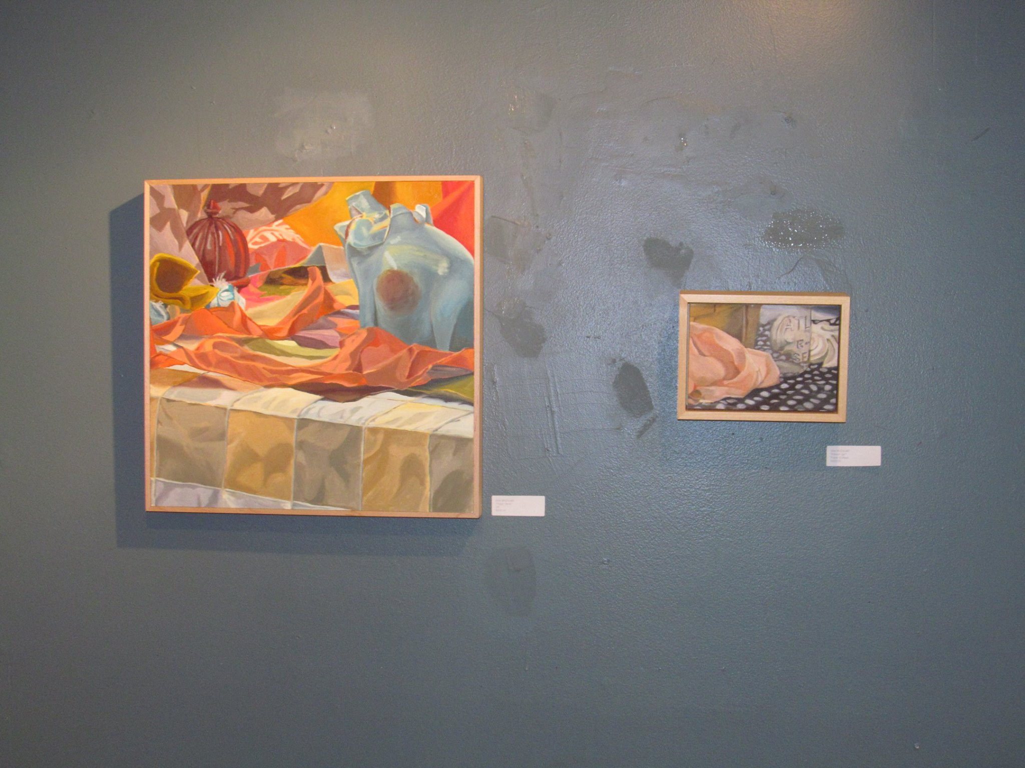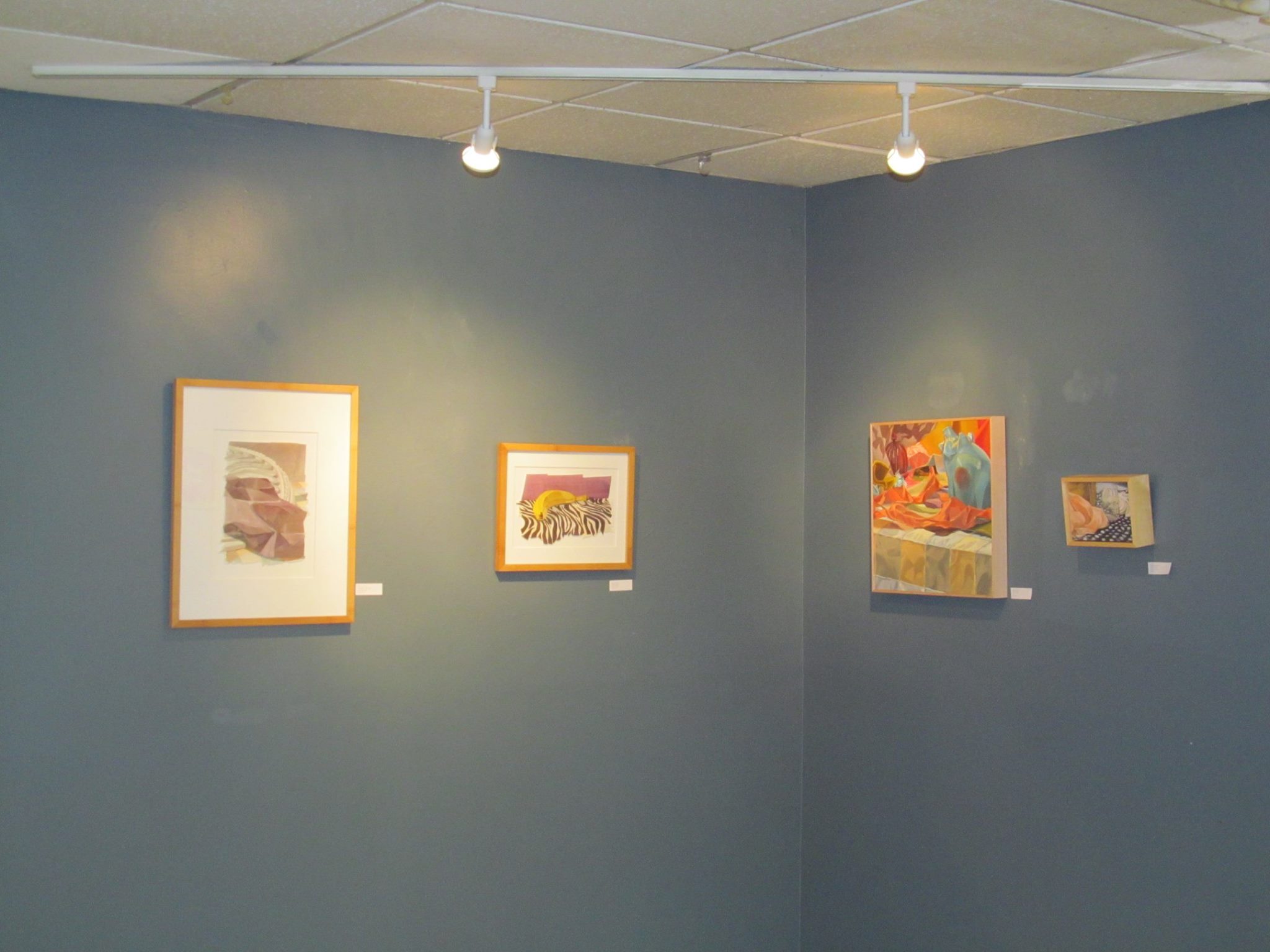 One artist in the gallery was Brie McDonald. Brie McDonald’s work was featured under lights at a corner section with a raised platform. Her finely crafted still life work, like a banana on a zebra print, showcased the exploration of textures. Across from Brie’s location was a wall showcasing some extraordinary landscapes created by Norma McDonald. I enjoyed these immensely as it represented the art I’d like to create if I could paint landscapes half as well as Norma.