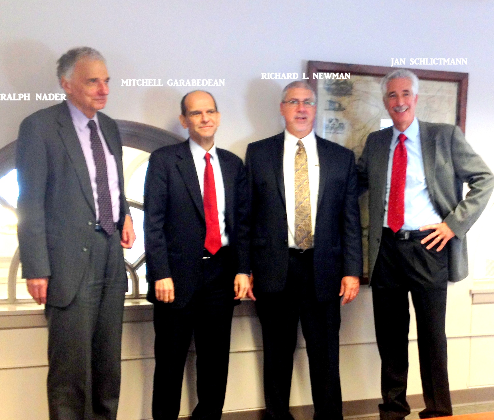 Mitchell Garabedean (left) concludes his speech. (to his right are Richard L. Newman, Jan Schlictmann and Ralph Nader